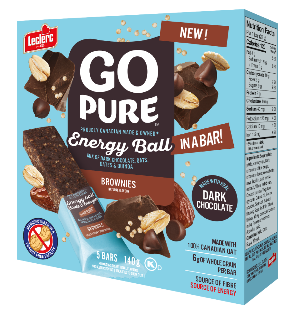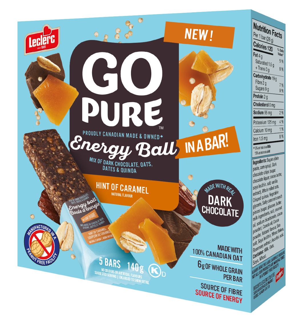 Sugars (date paste, corn syrup, fructose, honey) • Chocolate (sugar, chocolate liquor, cocoa butter, soya lecithin, vanilla extract, milk ingredients) • Whole rolled oats • Chocolate chips (sugar, chocolate liquor, cocoa butter, soya lecithin, salt, vanilla extract) • Crisped quinoa • Cocoa powder • Vegetable glycerin • Sea salt • Natural flavour • Soya lecithin • Salt • Wheat flakes