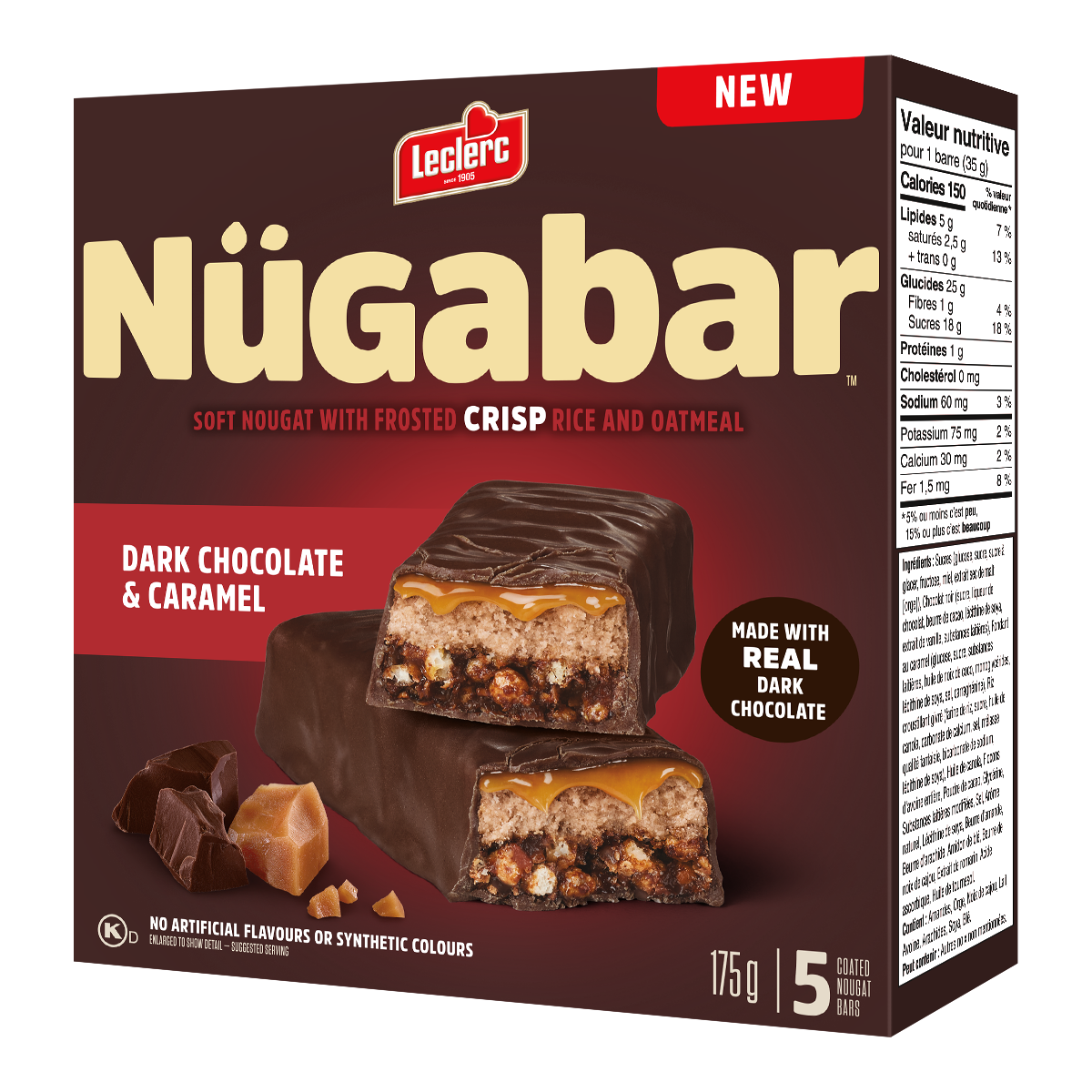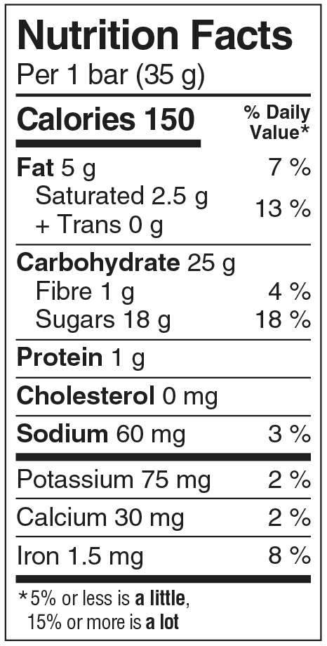 Sugars (glucose, sugar, icing sugar, fructose, honey, dry malt extract [barley]), Dark chocolate (sugar, chocolate liquor, cocoa butter, soya lecithin, vanilla extract, milk ingredients), Caramel fondant (glucose, sugar, milk ingredients, coconut oil, monoglycerides, soya lecithin, salt, carrageenan), Frosted crisp rice (rice flour, sugar, canola oil, calcium carbonate, salt, fancy molasses, sodium bicarbonate, soya lecithin), Canola oil, Whole rolled oats, Cocoa powder, Glycerin, Modified milk ingredients, Salt, Natural flavour, Soya lecithin, Almond butter, Peanut butter, Wheat starch, Cashew butter, Sunflower oil.