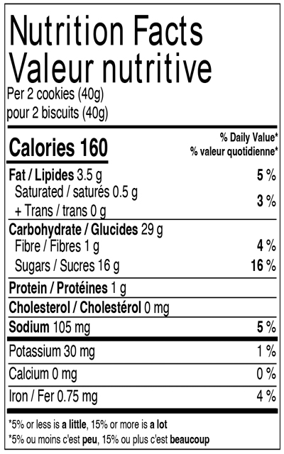 Cookie (enriched wheat flour, sugar, canola oil, mono and diglycerides, fancy molasses, sodium bicarbonate, salt, soya lecithin, natural flavour, modified milk ingredients, tartrazine and sunset yellow fcf and allura red), Apple filling (apple puree, glucose, sugar, glucose-fructose, pectin, citric acid, potassium sorbate, allura red). Contains: Milk, Soya, Wheat.