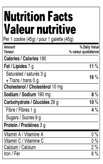 WHOLE ROLLED OATS, ENRICHED WHEAT FLOUR, SUGAR, PALM OIL, GLUCOSE, GLYCERIN, FANCY MOLASSES, LIQUID WHOLE EGG, LIQUID YOLK MIX (EGGS), SALT, BAKING POWDER, MODIFIED CORN STARCH, NATURAL FLAVOUR, GUM BLEND (XANTHAN GUM, LOCUST BEAN GUM, GUAR GUM), SOYA LECITHIN, SODIUM BICARBONATE, MODIFIED MILK INGREDIENTS. ALWAYS READ THE LABEL CAREFULLY BECAUSE NOT ALL OUR PRODUCTS ARE MANUFACTURED IN A PEANUT FREE FACILITY.