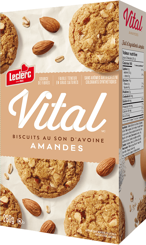 Enriched wheat flour, Sugars (brown sugar, sugar), Canola oil, Oat bran, Almonds, Whole rolled oats, Oat hull fibre, Liquid whole egg, Natural flavour, Sodium bicarbonate, Salt, Soya lecithin, Modified milk ingredients. Contains: Almonds, Eggs, Milk, Oats, Soya, Wheat.