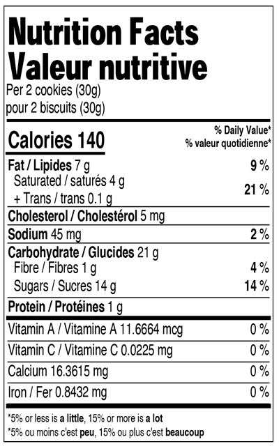 Milk chocolate (sugar, cocoa butter, chocolate liquor, milk ingredients, soya lecithin, vanillin), Enriched wheat flour, Maple flavoured filling (glucose, sugar, hydrogenated coconut and/or soybean oil, brown sugar, maple sugar, water, modified milk ingredients, salt, acethyled tartaric acid esters of mono- and diglycerides, natural and artificial flavour), Sugar, Butter (milk), Salt, Sodium bicarbonate, Soya lecithin, Artificial flavour.