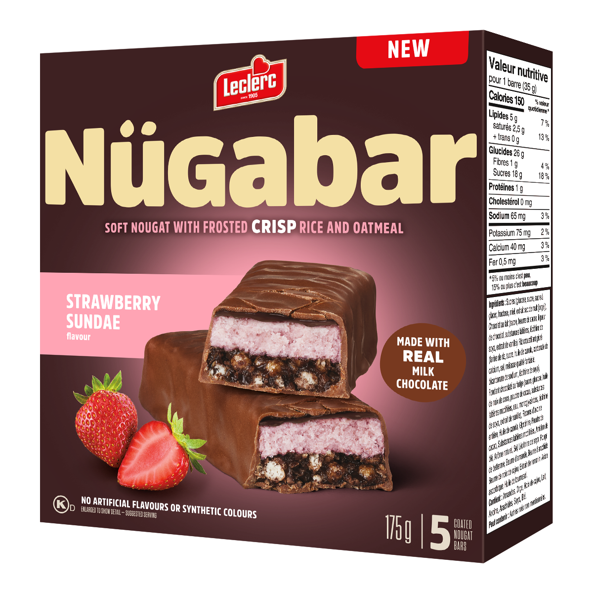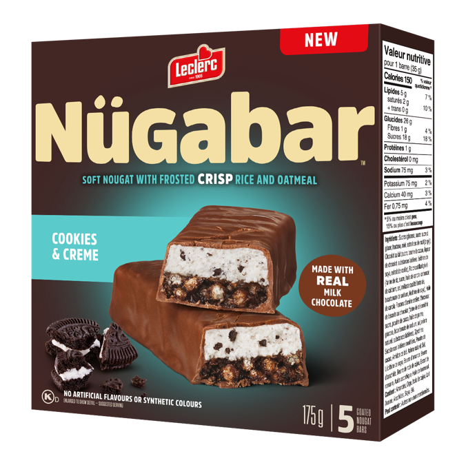 Sugars (glucose, sugar, icing sugar, fructose, honey, dry malt extract [barley]), Milk chocolate (sugar, cocoa butter, chocolate liquor, milk ingredients, soya lecithin, vanilla extract), Frosted crisp rice (rice flour, sugar, canola oil, calcium carbonate, salt, fancy molasses, sodium bicarbonate, soya lecithin), Canola oil, Whole rolled oats, Chocolate cookie crumbs (enriched wheat flour, sugar, cocoa powder, palm oil, glucose, sodium bicarbonate, salt, natural flavour, milk ingredients), Glycerin, Modified milk ingredients, Cocoa powder, Wheat starch, Natural flavour, Salt, Soya lecithin, Almond butter, Peanut butter, Cashew butter, Sunflower oil.