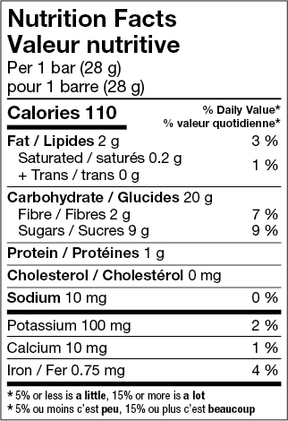 Sugars (dehydrated apples, corn syrup, date paste, fructose, honey), Whole rolled oats, Canola oil, Vegetable glycerin, Blueberry flavoured cranberries (cranberries, sugar, grape juice concentrate, blueberry juice concentrate, sunflower oil), Oat hull fibre, Black carrot concentrated (black carrot concentrated, citric acid), Natural flavour, Dehydrated raspberries, Dehydrated strawberries, Soya lecithin, Salt, Beet red, Modified milk ingredients, Wheat flakes.