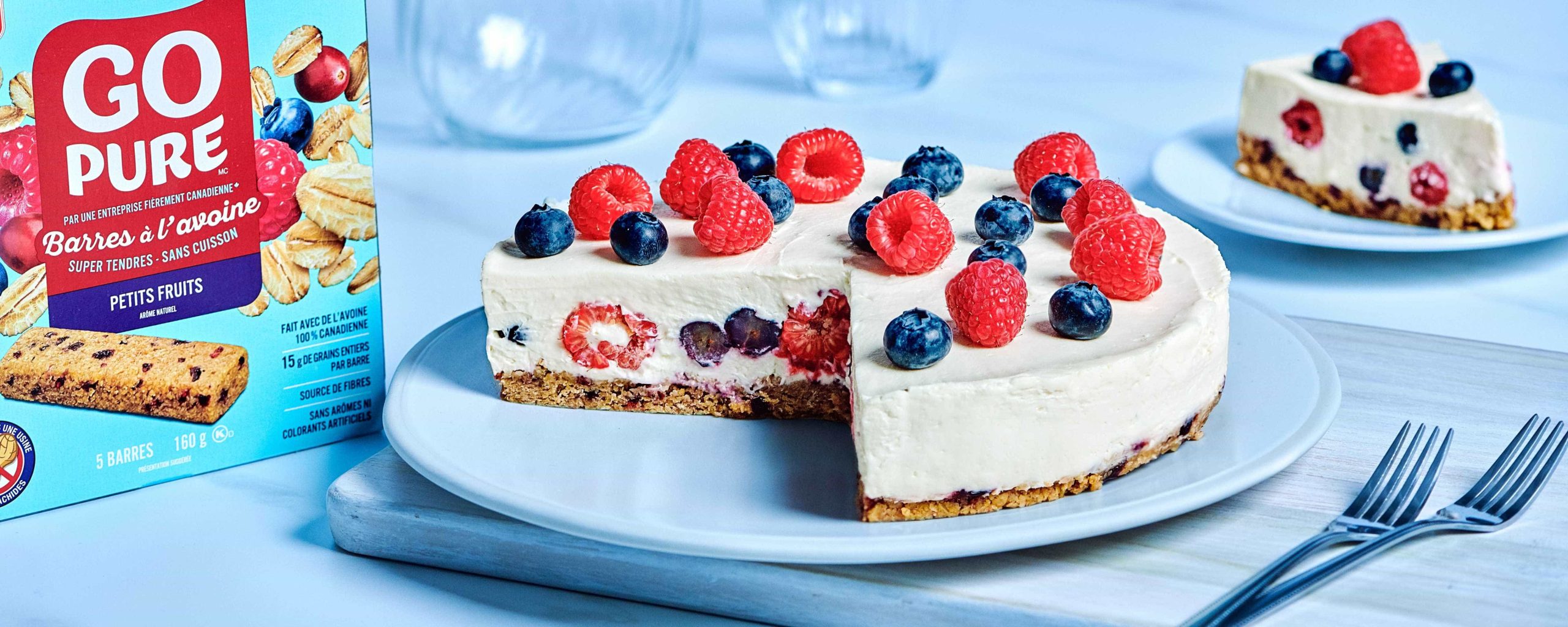 - In a bowl, beat the cream cheese, icing sugar, lemon juice and vanilla with an electric mixer. Add the 35% cream and whisk until stiff peaks form. Pour half of the cheesecake mixture over the oat bar crust. Top with the blueberries and raspberries. Cover with the remaining cheesecake mixture. Smooth out the surface of the cake using a small offset spatula. Cover and refrigerate for 5 hours or until the cheesecake mixture is set.