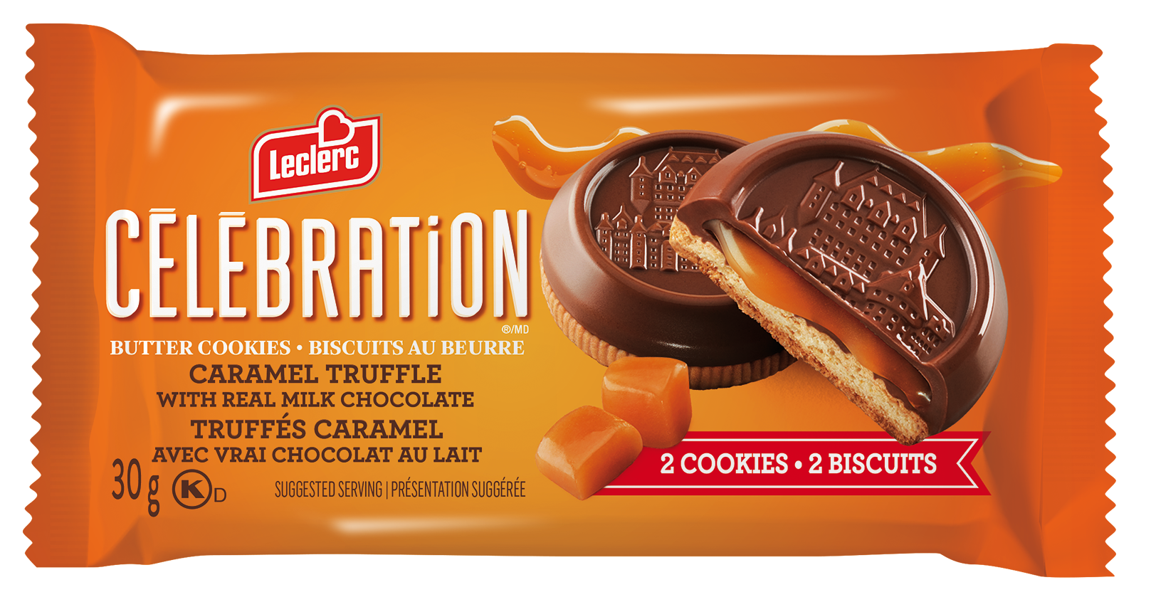 Biscuits au beurre truffés caramel avec vrai chocolat au lait (2 biscuits par sachet)