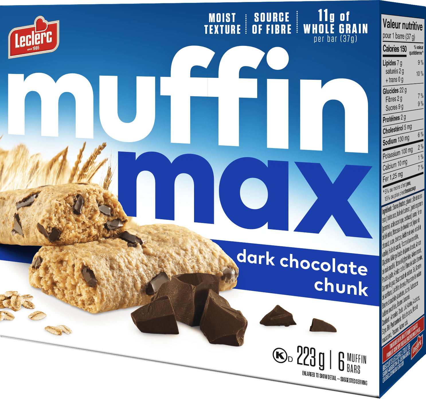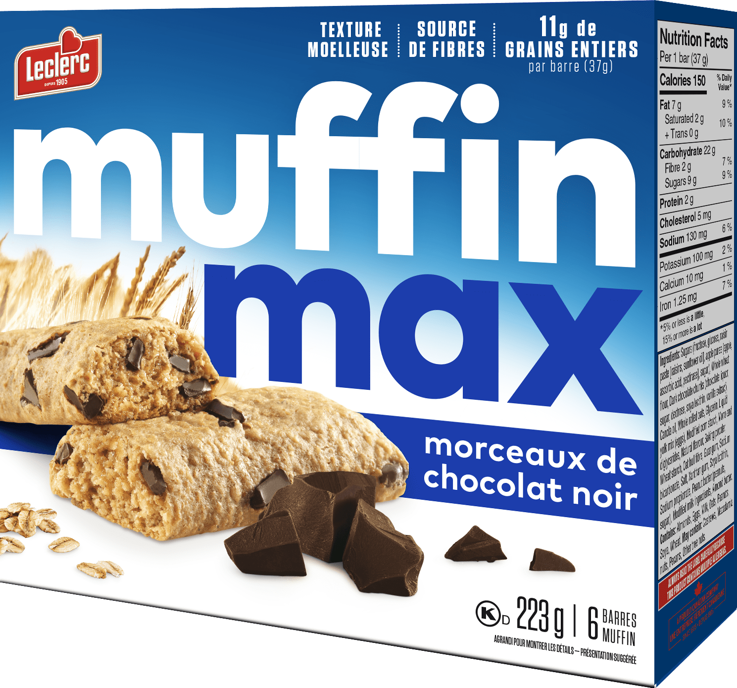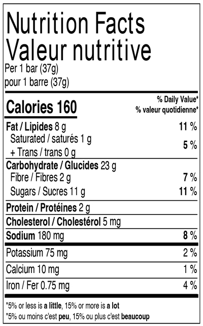 Sucres (fructose, glucose, pâte de raisins secs [raisins secs, huile de tournesol], purée de pomme [pommes, acide ascorbique, pectinase], sucre), Farine de blé entier, Morceaux de chocolat noir (liqueur de chocolat, sucre, dextrose, lécithine de soya, extrait de vanille), Huile de canola, Flocons d'avoine entière, Glycérine, Mélange liquide de jaunes d'oeufs, Amidon de maïs modifié, Mono et diglycérides, Arôme naturel, Poudre à pâte, Amidon de blé, Fibres de balles d'avoine, Gomme de guar, Bicarbonate de sodium, Sel, Gomme de xanthane, Lécithine de soya, Propionate de sodium, Beurre d'arachide (arachides, sucre), Substances laitières modifiées, Beurre d'amande.