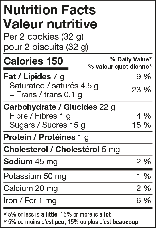 Chocolat au lait (sucre, beurre de cacao, liqueur de chocolat, substances laitières, lécithine de soya, vanilline), Farine de blé enrichie, Garniture aromatisée à la fraise et crème (glucose, sucre, huile de noix de coco, eau, substances laitières modifiées, monoglycérides, bioxyde de titane, arôme naturel, sel, lécithine de soya, rouge allura), Sucre, Beurre, Sel, Bicarbonate de sodium,