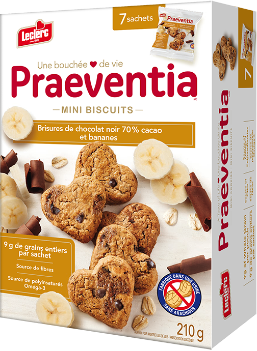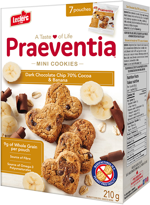 Mélange d'avoine (flocons d'avoine entière, farine d'avoine entière), Sucres (cassonade, bananes déshydratées), Farine de blé enrichie, Huile de canola, Brisures de chocolat noir 70% cacao (liqueur de chocolat, sucre, dextrose, poudre de cacao, beurre de cacao, lécithine de soya, extrait de vanille), Fibres de balles d'avoine, Arôme naturel, Graines de chia moulues, Bicarbonate de sodium, Sel, Substances laitières modifiées. Contient : Lait, Avoine, Soya, Blé.
