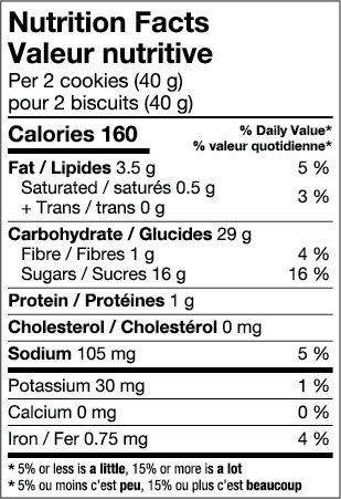Biscuit (farine de blé enrichie, sucre, huile de canola, mono et diglycérides, mélasse qualité fantaisie, bicarbonate de sodium, sel, lécithine de soya, arôme naturel, substances laitières modifiées, tartrazine et jaune soleil fcf et rouge allura), Garniture aux pommes (purée de pommes, glucose, sucre, glucose-fructose, pectine, acide citrique, sorbate de potassium, rouge allura). Contient : Lait, Soya, Blé.