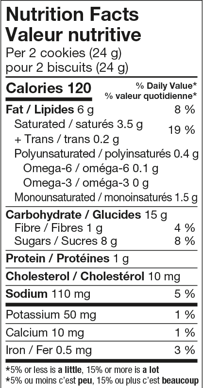 Chocolat au lait (sucre, beurre de cacao, liqueur de chocolat, substances laitières, lécithine de soya, extrait de vanille), Flocons d'avoine entière, Sucres (sucre, mélasse qualité fantaisie, pâte de raisins secs), Farine de blé enrichie, Beurre, Sel, Arôme naturel, Bicarbonate de sodium, Lécithine de soya, Huile de tournesol à teneur élevée en acide oléique.