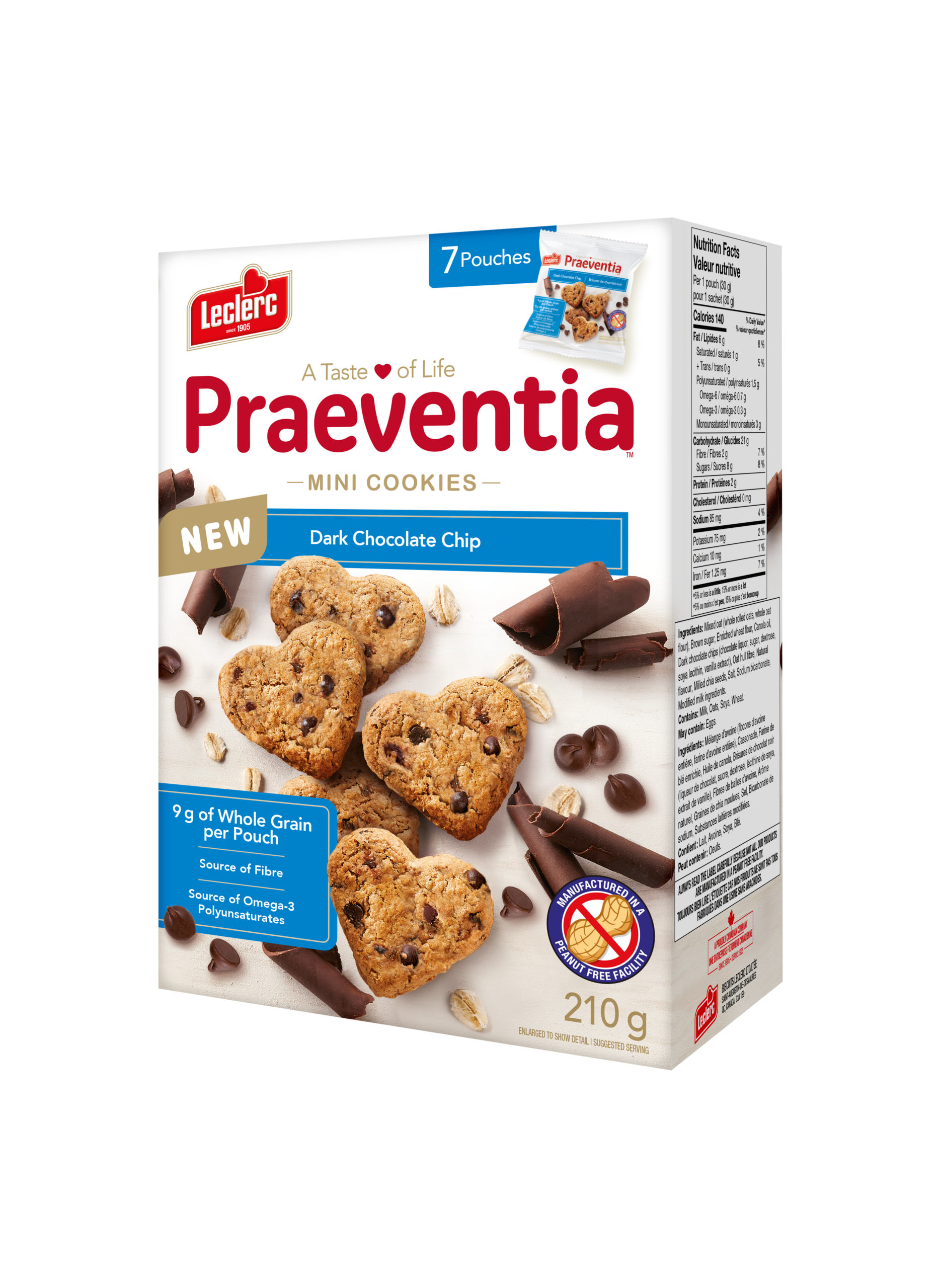 Mélange d'avoine (flocons d'avoine entière, farine d'avoine entière), Cassonade, Farine de blé enrichie, Huile de canola, Brisures de chocolat noir (liqueur de chocolat, sucre, dextrose, lécithine de soya, extrait de vanille), Fibres de balles d'avoine, Arôme naturel, Graines de chia moulues, Sel, Bicarbonate de sodium, Substances laitières modifiées. Contient : Lait, Avoine, Soya, Blé.