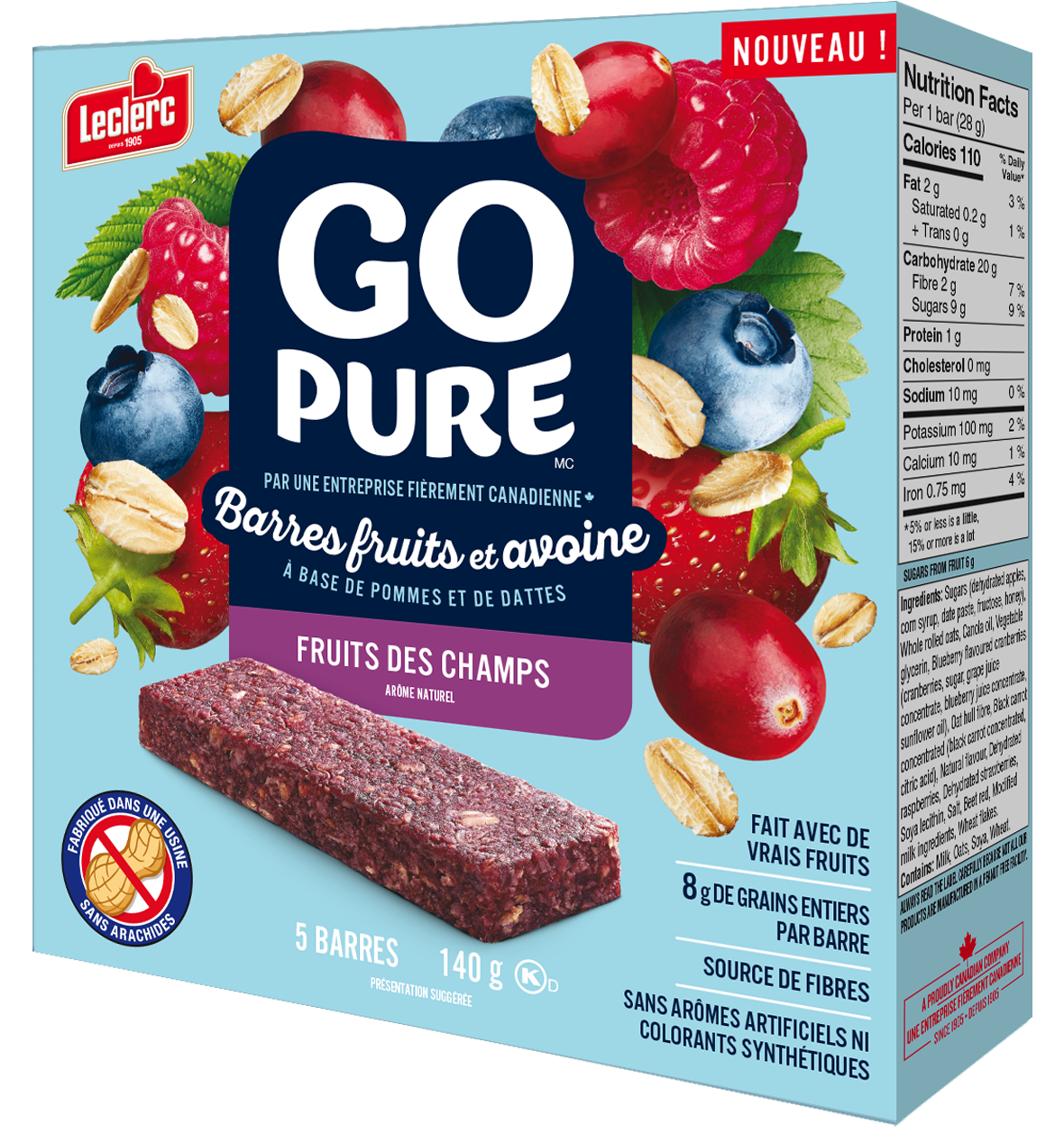 Le goût savoureux des framboises bien mélangé avec les bienfaits de l’avoine enfin en format familial! Une barre innovante et santé, faite avec de vrais fruits qui contient 8 g de grains entiers, et est une source de fibres. Elle est certifiée sans arachides et parfaite pour la boîte à lunch! Go Pure, Purement bon!