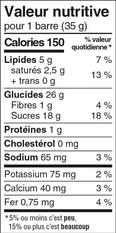 Sucres (glucose, sucre, sucre à glacer, fructose, miel), Chocolat au lait (sucre, beurre de cacao, liqueur de chocolat, substances laitières, lécithine de soya, extrait de vanille), Fondant chocolaté au fudge (sucre, glucose, huile de noix de coco, poudre de cacao, substances laitières modifiées, eau, monoglycérides, lécithine de soya, extrait de vanille), Riz croustillant givré (farine de riz, sucre, huile de canola, carbonate de calcium, sel, mélasse qualité fantaisie, bicarbonate de sodium, lécithine de soya), Flocons d'avoine entière, Huile de canola, Poudre de cacao, Glycérine, Substances laitières modifiées, Sel, Arôme naturel, Lécithine de soya, Amidon de blé, Beurre d'arachide, Beurre d'amande, Beurre de noix de cajou, Extrait de romarin, Acide ascorbique, Huile de tournesol.