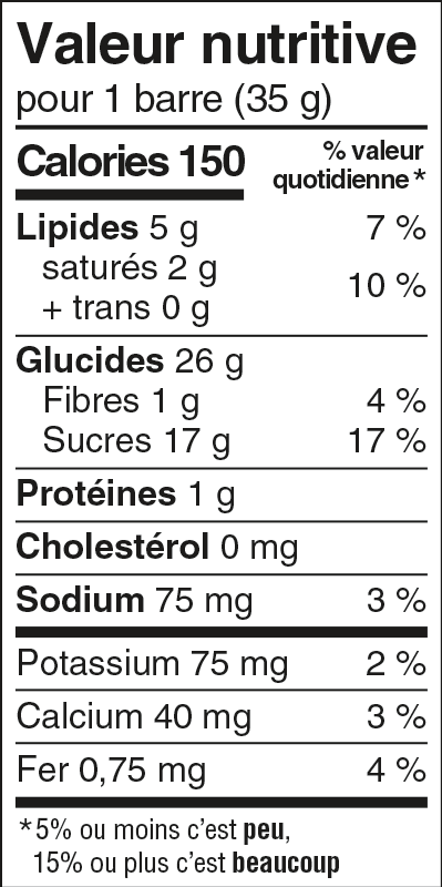 Sucres (glucose, sucre, sucre à glacer, fructose, miel, extrait sec de malt [orge]), Chocolat au lait (sucre, beurre de cacao, liqueur de chocolat, substances laitières, lécithine de soya, extrait de vanille), Riz croustillant givré (farine de riz, sucre, huile de canola, carbonate de calcium, sel, mélasse qualité fantaisie, bicarbonate de sodium, lécithine de soya), Huile de canola, Flocons d'avoine entière, Morceaux de biscuits au chocolat (farine de blé enrichie, sucre, poudre de cacao, huile de palme, glucose, bicarbonate de sodium, sel, arôme naturel, substances laitières), Substances laitières modifiées, Glycérine, Poudre de cacao, Amidon de blé, Sel, Arôme naturel, Lécithine de soya, Beurre d'amande, Beurre d'arachide, Beurre de noix de cajou, Extrait de romarin, Acide ascorbique, Carotène, Huile de tournesol.