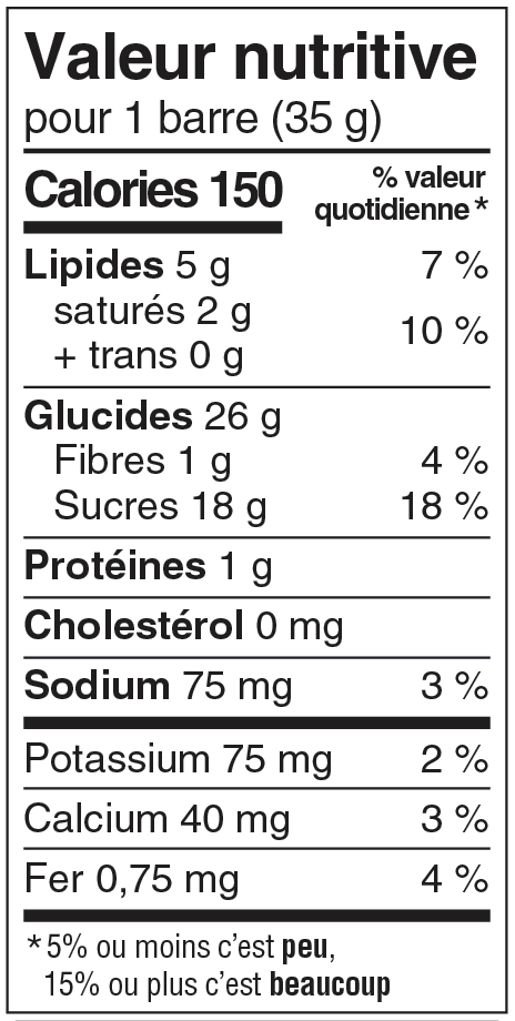 Sucres (glucose, sucre, sucre à glacer, fructose, miel, extrait sec de malt [orge]), Chocolat au lait (sucre, beurre de cacao, liqueur de chocolat, substances laitières, lécithine de soya, extrait de vanille), Riz croustillant givré (farine de riz, sucre, huile de canola, carbonate de calcium, sel, mélasse qualité fantaisie, bicarbonate de sodium, lécithine de soya), Huile de canola, Flocons d'avoine entière, Morceaux de biscuits au chocolat (farine de blé enrichie, sucre, poudre de cacao, huile de palme, glucose, bicarbonate de sodium, sel, arôme naturel, substances laitières, Glycérine, Substances laitières modifiées, Poudre de cacao, Amidon de blé, Sel, Arôme naturel, Lécithine de soya, Beurre d'arachide, Beurre d'amande, Beurre de noix de cajou, Carotène, Huile de tournesol.