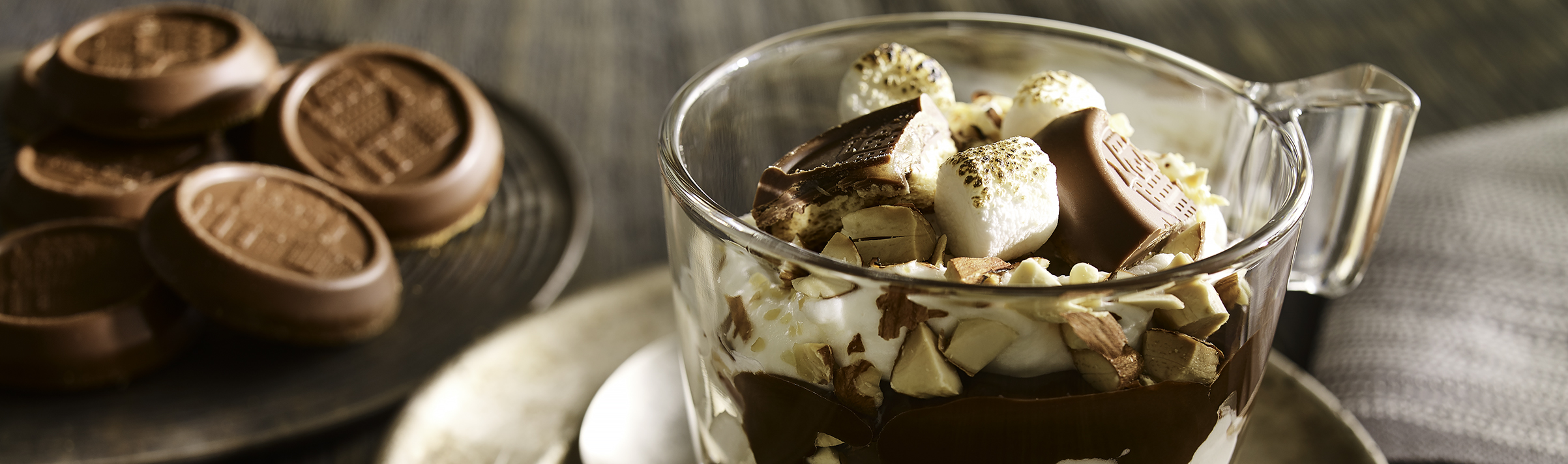 Before serving, top each dessert cup with three marshmallows. Quickly brown marshmallows with a kitchen torch.