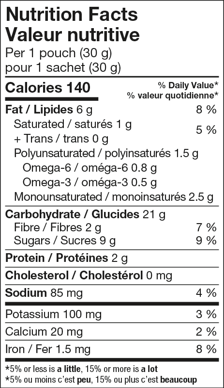 Mixed oat (whole rolled oats, whole oat flour), Brown sugar, Enriched wheat flour, Canola oil, Dark chocolate chips 70% cocoa (chocolate liquor, sugar, dextrose, soya lecithin, vanilla extract), Dehydrated cranberries (sugar, cranberries, sun ower oil), Cocoa powder, Milled chia seeds, Natural flavour, Salt, Sodium bicarbonate, Modified milk ingredients.