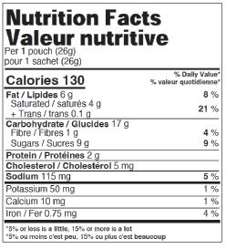 Milk chocolate (sugar, cocoa butter, chocolate liquor, milk ingredients, soya lecithin, vanilla extract), Whole rolled oats, Sugars (sugar, fancy molasses), Enriched wheat flour, Butter (milk), Modified palm and palm kernel oils, Raisin paste (raisins, sunflower oil), Salt, Natural flavour, Sodium bicarbonate, Soya lecithin.