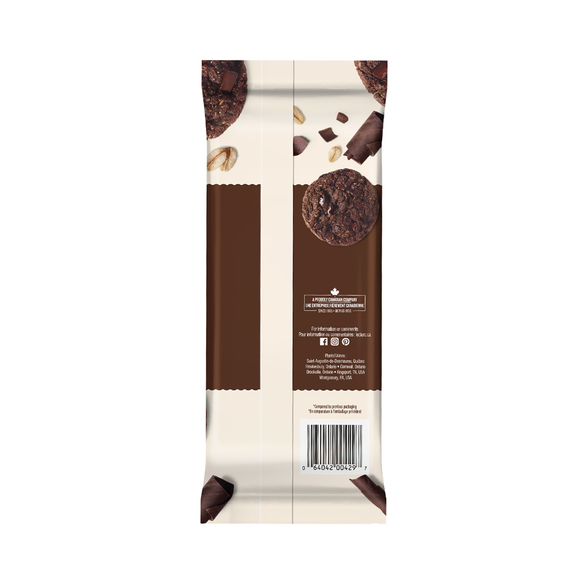 Enriched wheat flour, Sugars (brown sugar, sugar), Canola oil, Dark chocolate chunks 70% cocoa (chocolate liquor, sugar, dextrose, soya lecithin, vanilla extract), Oat bran, Cocoa powder, Oat hull fibre, Liquid whole egg, Natural flavour, Sodium bicarbonate, Salt, Modified milk ingredients. Contains: Eggs, Milk, Oats, Soya, Wheat.