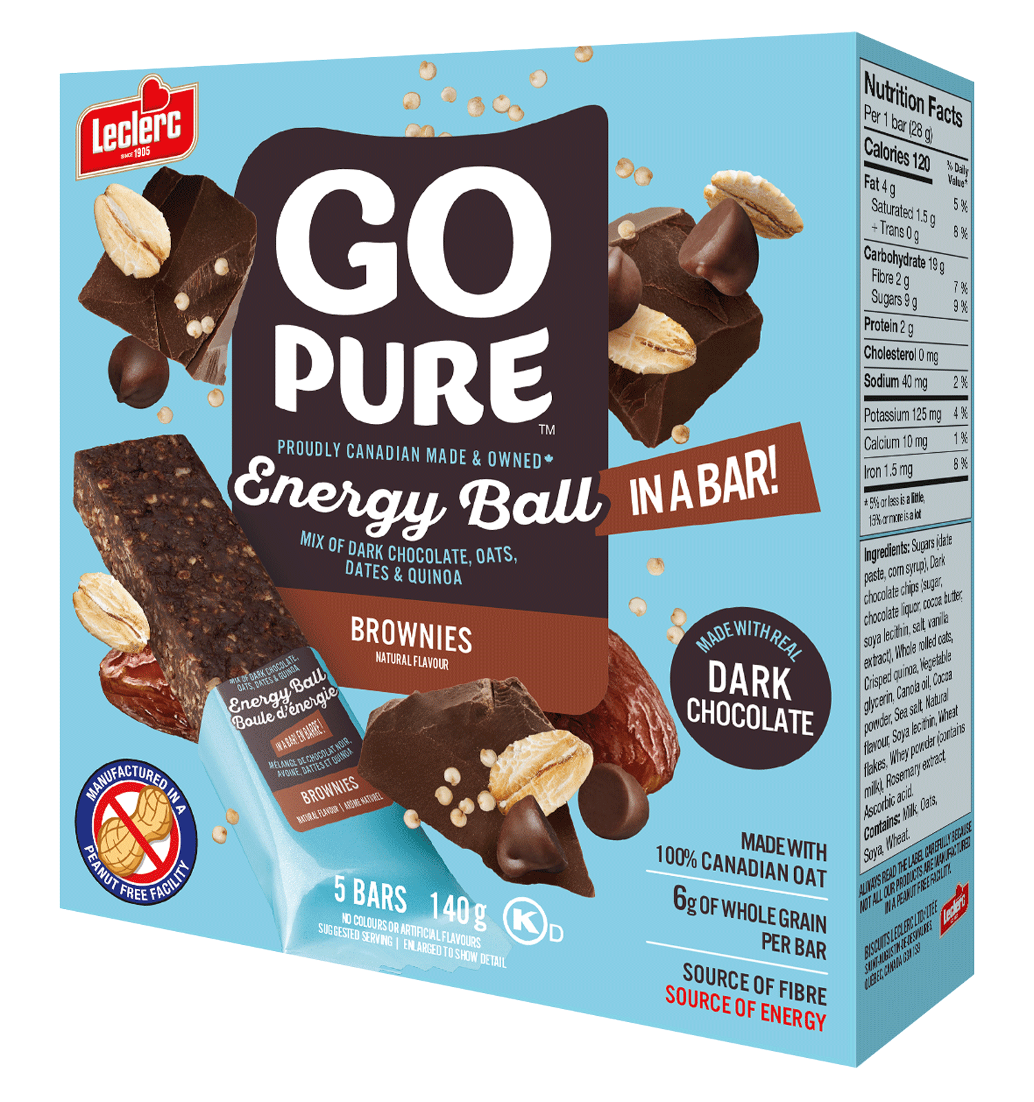 Sugars (date paste, corn syrup, fructose, honey) • Chocolate (sugar, chocolate liquor, cocoa butter, soya lecithin, vanilla extract, milk ingredients) • Whole rolled oats • Chocolate chips (sugar, chocolate liquor, cocoa butter, soya lecithin, salt, vanilla extract) • Crisped quinoa • Cocoa powder • Vegetable glycerin • Sea salt • Natural flavour • Soya lecithin • Salt • Wheat flakes