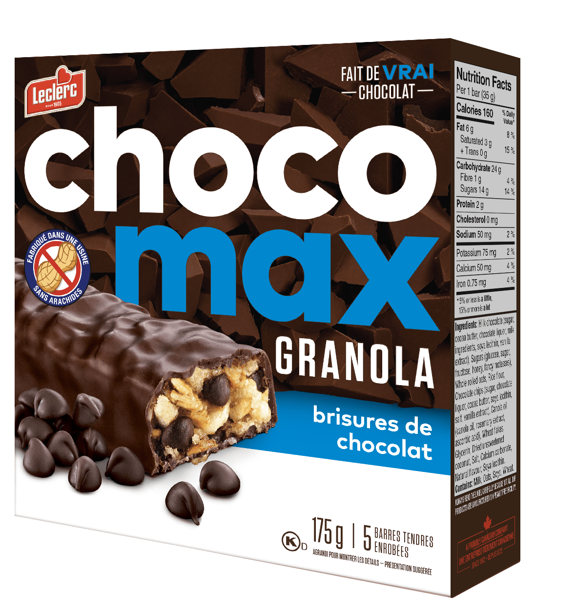 Milk chocolate (sugar, cocoa butter, chocolate liquor, milk ingredients, soya lecithin, vanilla extract), Sugars (glucose, sugar, fructose, honey, fancy molasses), Whole rolled oats, Rice flour, Chocolate chips (sugar, chocolate liquor, cocoa butter, soya lecithin, salt, vanilla extract), Canola oil (canola oil, rosemary extract, ascorbic acid), Wheat flakes, Glycerin, Dried unsweetened coconut, Salt, Calcium carbonate, Natural flavour, Soya lecithin.