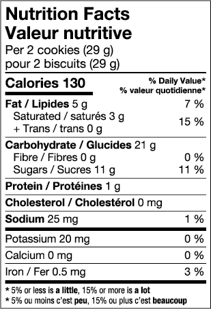 Cookie (enriched wheat flour, sugar, palm oil, canola oil, milk ingredients, sodium bicarbonate, natural flavour, soya lecithin, carotene), Creme (sugar, modified palm and palm kernel oils, wheat starch, natural flavour, soya lecithin, salt), Raspberry filling (glucose, sugar, water, glycerin, fructose, raspberry puree, pectin, sodium citrate, natural flavour, carrot and blackcurrant concentrate, citric acid).