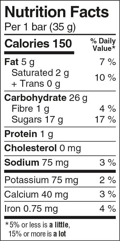 Sugars (glucose, sugar, icing sugar, fructose, honey, dry malt extract [barley]), Milk chocolate (sugar, cocoa butter, chocolate liquor, milk ingredients, soya lecithin, vanilla extract), Frosted crisp rice (rice flour, sugar, canola oil, calcium carbonate, salt, fancy molasses, sodium bicarbonate, soya lecithin), Canola oil, Whole rolled oats, Chocolate cookie crumbs (enriched wheat flour, sugar, cocoa powder, palm oil, glucose, sodium bicarbonate, salt, natural flavour, milk ingredients), Modified milk ingredients, Glycerin, Cocoa powder, Wheat starch, Salt, Natural flavour, Soya lecithin, Almond butter, Peanut butter, Cashew butter, Rosemary extract, Ascorbic acid, Carotene, Sunflower oil.