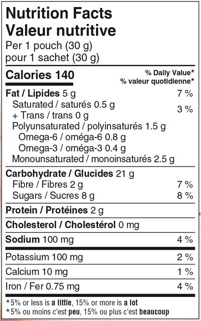 Mixed oat (whole rolled oats, whole oat flour), Brown sugar, Enriched wheat flour, Canola oil, Beet powder (beet, rice hull powder), Oat hull fibre, Dehydrated raspberries, Milled chia seeds, Natural flavour, Sodium bicarbonate, Salt, Modified milk ingredients, Soya lecithin. Contains: Milk, Oats, Soya, Wheat.