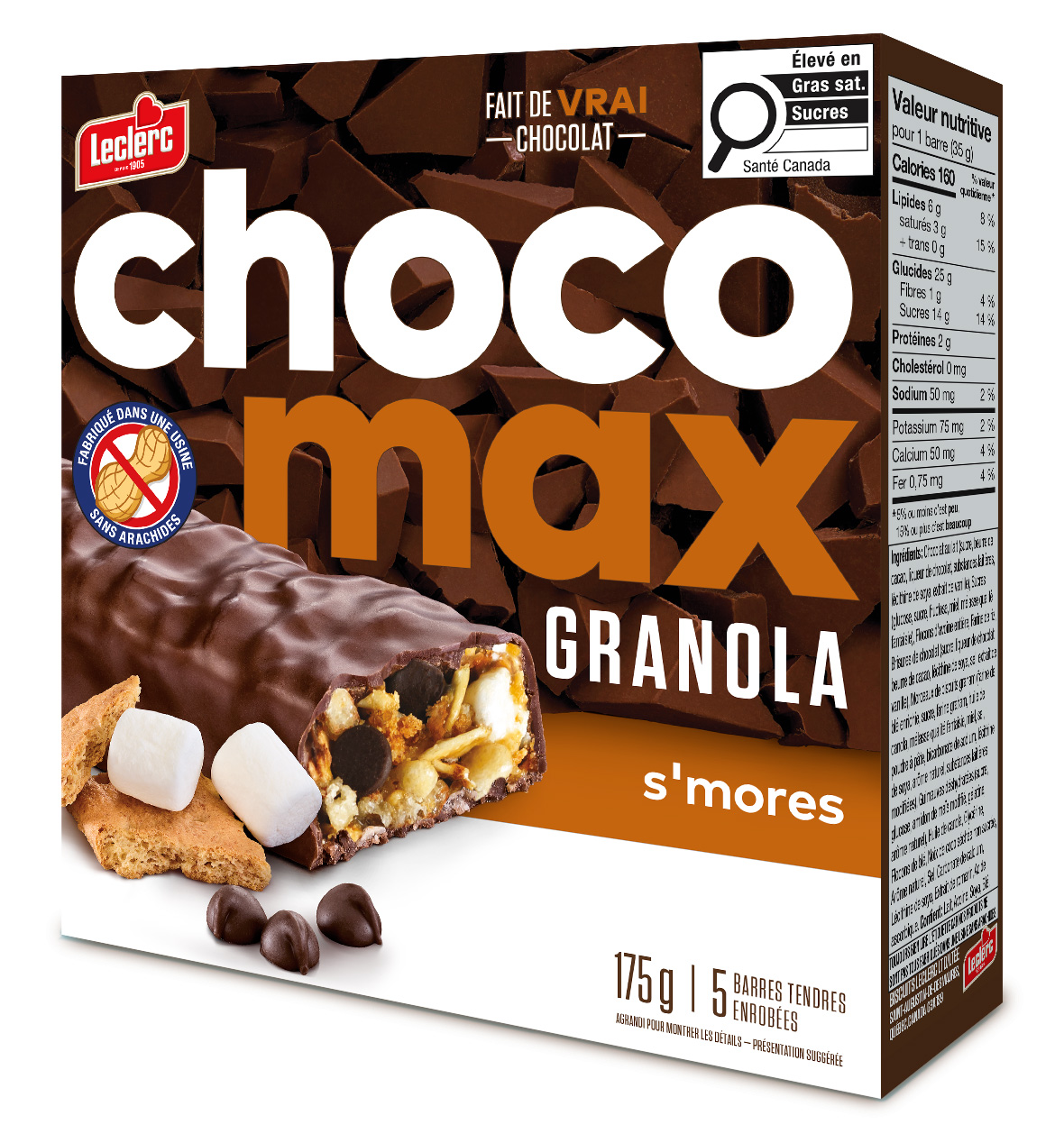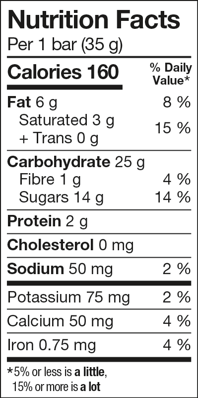 Milk chocolate (sugar, cocoa butter, chocolate liquor, milk ingredients, soya lecithin, vanilla extract), Sugars (glucose, sugar, fructose, honey, fancy molasses), Whole rolled oats, Rice flour, Chocolate chips (sugar, chocolate liquor, cocoa butter, soya lecithin, salt, vanilla extract), Graham cookies crumbs (enriched wheat flour, sugar, graham flour, canola oil, fancy molasses, honey, salt, baking powder, sodium bicarbonate, soya lecithin, natural flavour, modified milk ingredients), Dehydrated marshmallow (sugar, glucose, modified corn starch, gelatin, natural flavour), Canola oil, Glycerin, Wheat flakes, Dried unsweetened coconut, Natural flavour, Salt, Calcium carbonate, Soya lecithin, Rosemary extract, Ascorbic acid.