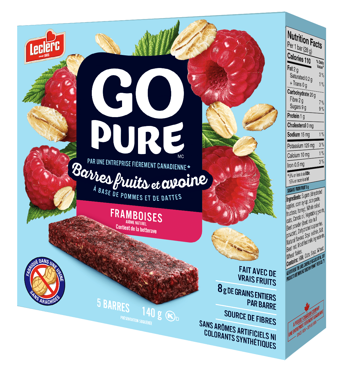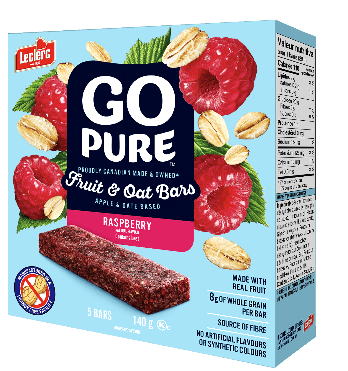 Le goût savoureux des framboises bien mélangé avec les bienfaits de l’avoine. Une barre innovante et santé, faite avec de vrais fruits qui contient 8 g de grains entiers, et est une source de fibres. Elle est certifiée sans arachides et parfaite pour la boîte à lunch! Go Pure, Purement bon!