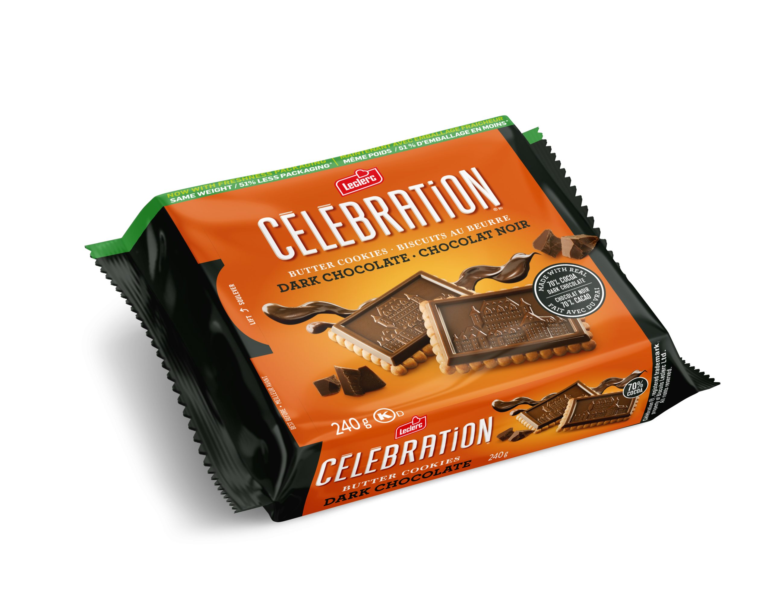 Chocolat noir 70% cacao (liqueur de chocolat, sucre, beurre de cacao, substances laitières, lécithine de soya, extrait de vanille), Farine de blé enrichie, Sucre, Beurre (lait), Bicarbonate de sodium, Sel, Lécithine de soya, Arôme artificiel. Contient : Lait, Soya, Blé.