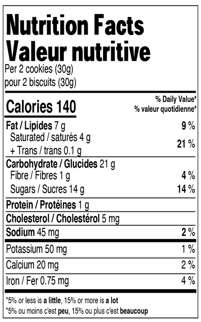 Chocolat au lait (sucre, beurre de cacao, liqueur de chocolat, substances laitières, lécithine de soya, vanilline), Farine de blé enrichie, Garniture au caramel (glucose, cassonade, sucre, huile de noix de coco et/ou de soya hydrogénée, eau, substances laitières modifiées, sel, arôme artificiel, lécithine de soya), Sucre, Beurre (lait), Sel, Bicarbonate de sodium, Lécithine de soya, Arôme artificiel.