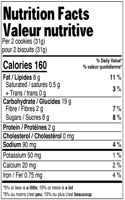Farine de blé enrichie, Sucres (cassonade, sucre), Huile de canola, Son d'avoine, Amandes, Flocons d'avoine entière, Fibres de balles d'avoine, Oeuf entier liquide, Arôme naturel, Bicarbonate de sodium, Sel, Lécithine de soya, Substances laitières modifiées. Contient : Amandes, Oeufs, Lait, Avoine, Soya, Blé.