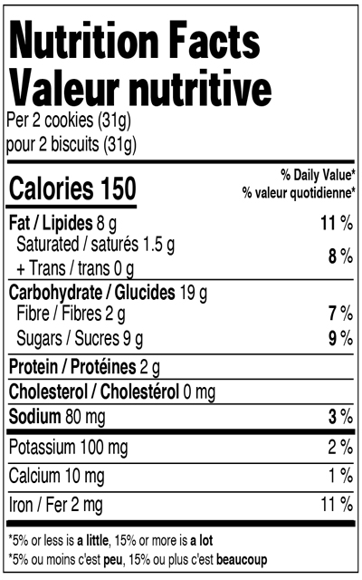 Farine de blé enrichie, Sucres (cassonade, sucre), Huile de canola, Morceaux de chocolat noir 70% cacao (liqueur de chocolat, sucre, dextrose, lécithine de soya, extrait de vanille), Son d'avoine, Poudre de cacao, Fibres de balles d'avoine, Oeuf entier liquide, Arôme naturel, Bicarbonate de sodium, Sel, Substances laitières modifiées. Contient : Oeufs, Lait, Avoine, Soya, Blé.