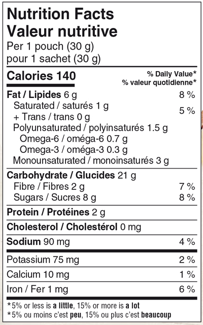 Mélange d'avoine (flocons d'avoine entière, farine d'avoine entière), Sucres (cassonade, bananes déshydratées), Farine de blé enrichie, Huile de canola, Brisures de chocolat noir 70% cacao (liqueur de chocolat, sucre, dextrose, poudre de cacao, beurre de cacao, lécithine de soya, extrait de vanille), Fibres de balles d'avoine, Arôme naturel, Graines de chia moulues, Bicarbonate de sodium, Sel, Substances laitières modifiées. Contient : Lait, Avoine, Soya, Blé.