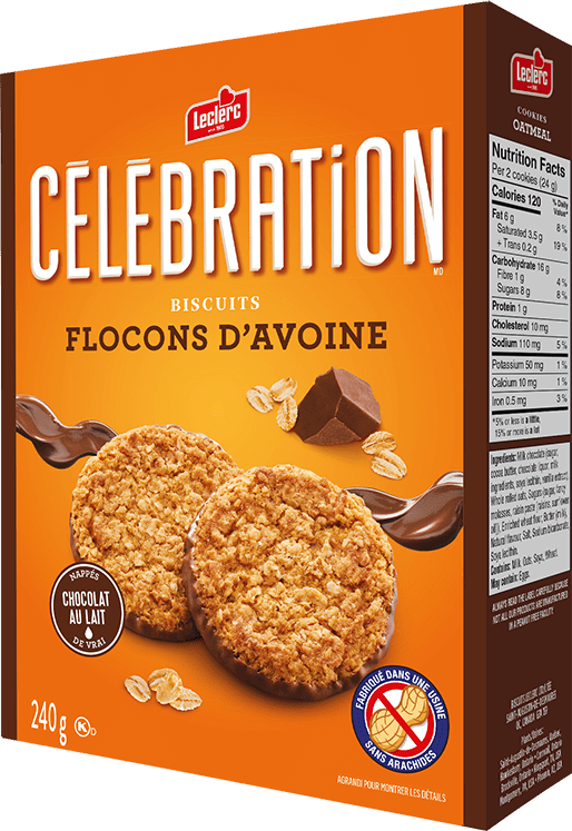 Chocolat au lait (sucre, beurre de cacao, liqueur de chocolat, substances laitières, lécithine de soya, extrait de vanille), Flocons d'avoine entière, Sucres (sucre, mélasse qualité fantaisie, pâte de raisins secs [raisins secs, huile de tournesol]), Farine de blé enrichie, Beurre (lait), Arôme naturel, Sel, Bicarbonate de sodium, Lécithine de soya. Contient : Lait, Avoine, Soya, Blé.
