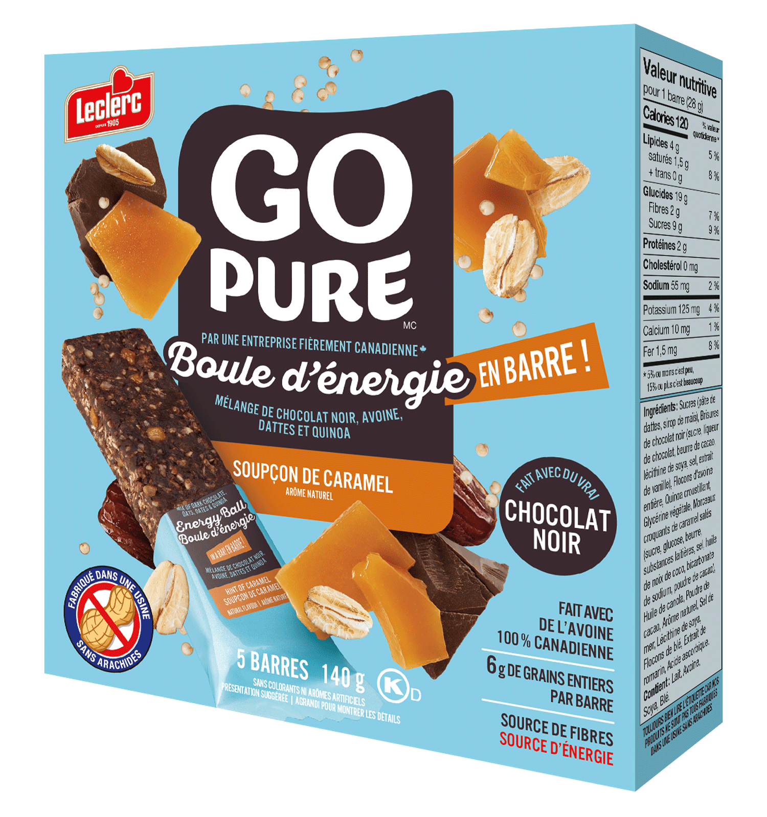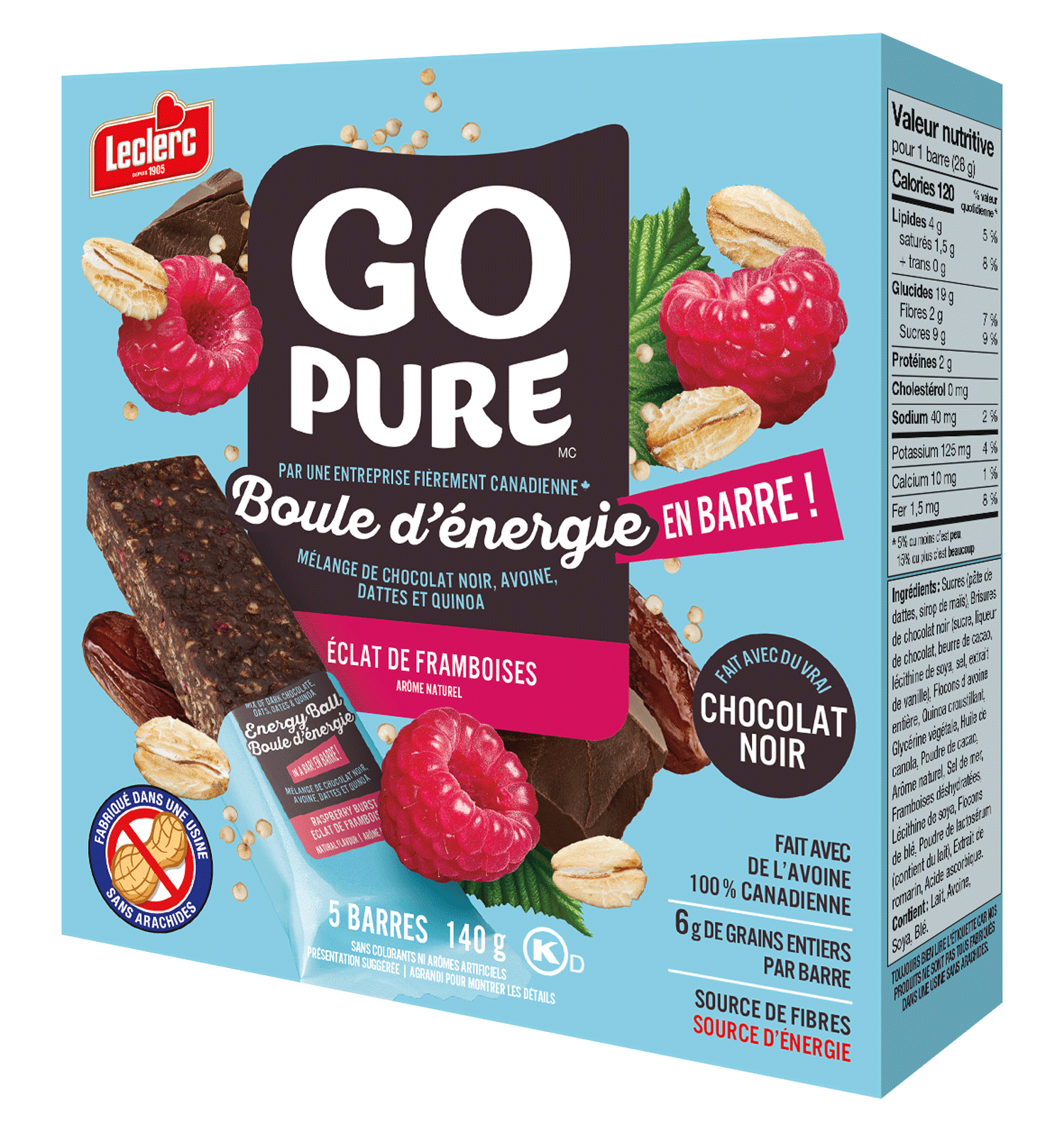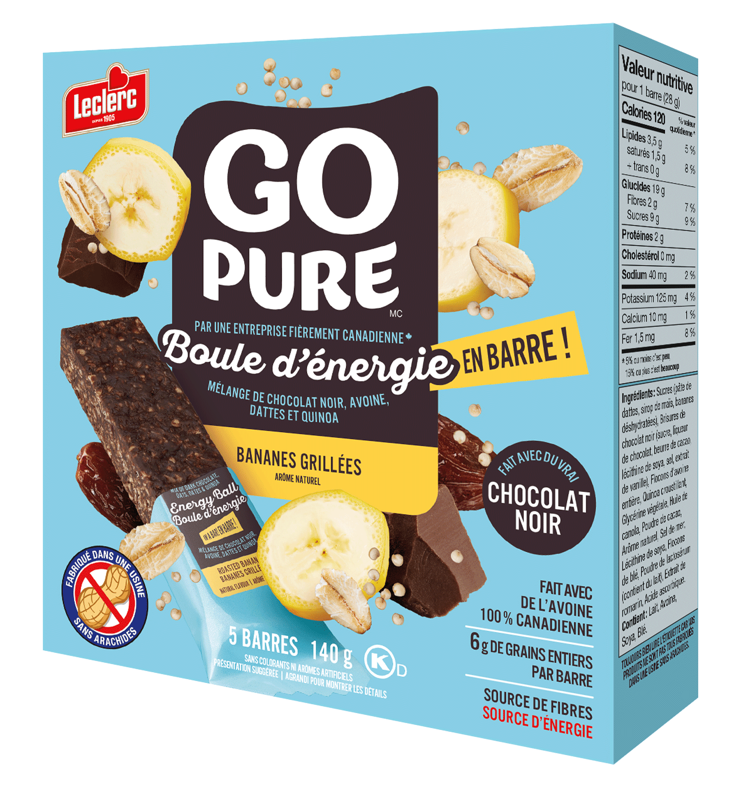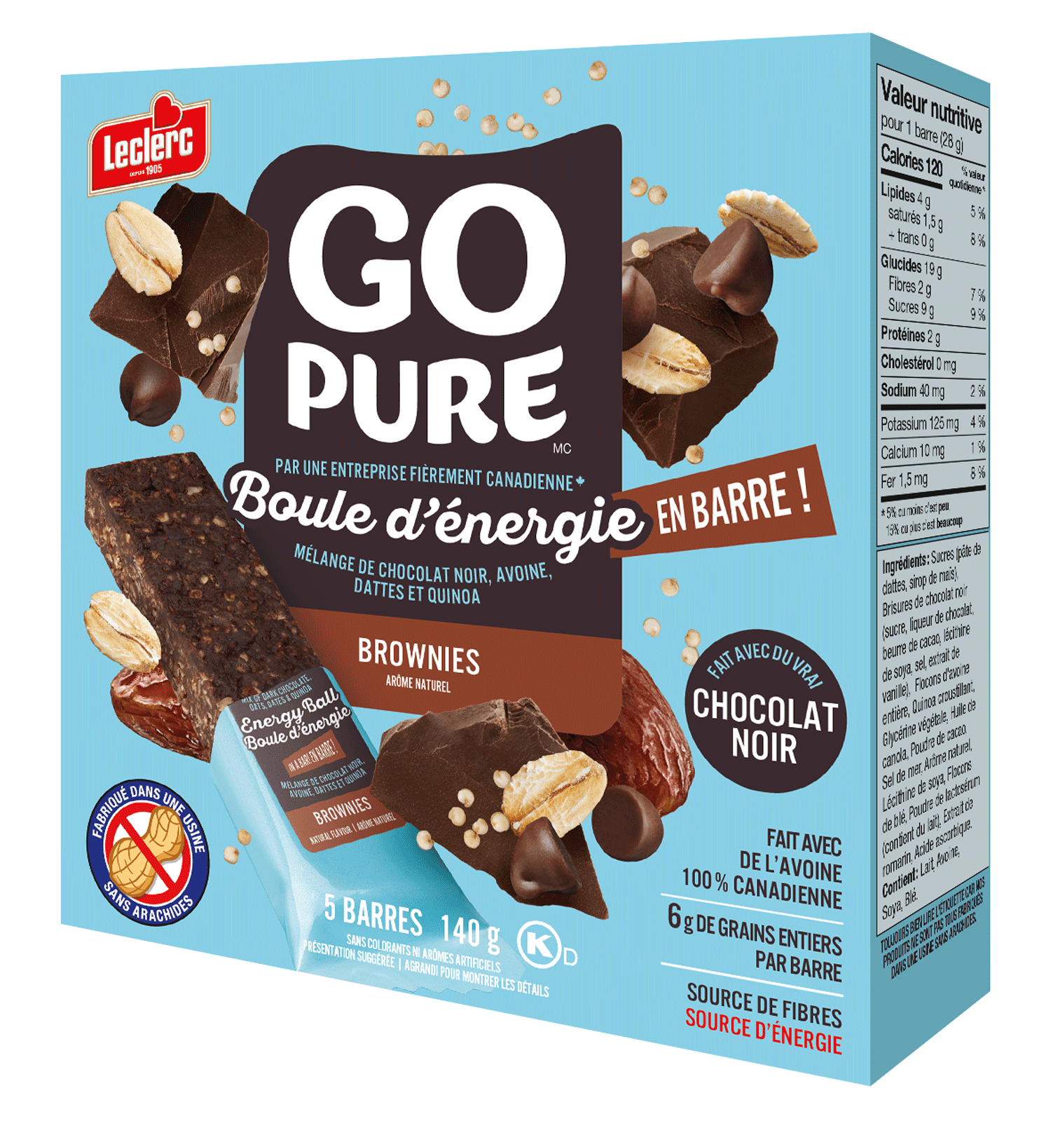 Sucres (pâte de dattes, sirop de maïs), Brisures de chocolat noir (sucre, liqueur de chocolat, beurre de cacao, lécithine de soya, sel, extrait de vanille), Flocons d'avoine entière, Quinoa croustillant, Huile de canola, Glycérine végétale, Bleuets sauvages déshydratés (bleuets, sucre, huile de tournesol), Poudre de cacao, Arôme naturel, Sel de mer, Lécithine de soya, Acide citrique, Flocons de blé, Poudre de lactosérum (contient du lait), Extrait de romarin, Acide ascorbique.