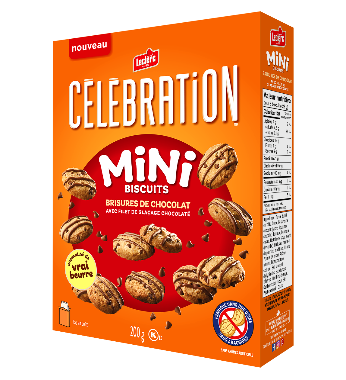 Farine de blé enrichie • Sucre • Brisures de chocolat (sucre, liqueur de chocolat, dextrose, beurre de cacao, lécithine de soya, extrait de vanille) • Huiles de palme et de palmiste modifiées • Beurre • Poudre de cacao • Arôme naturel • Bicarbonate de sodium • Sel • Mono et diglycérides • Substances laitières • Lécithine de soya