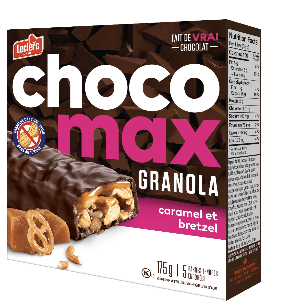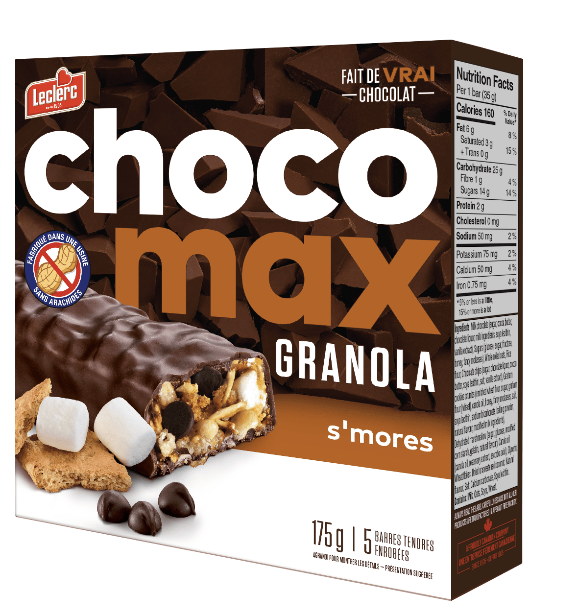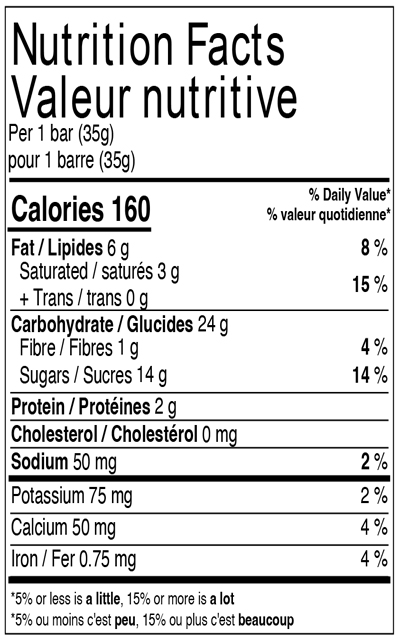 Chocolat au lait (sucre, beurre de cacao, liqueur de chocolat, substances laitières, lécithine de soya, extrait de vanille), Sucres (glucose, sucre, fructose, miel, mélasse qualité fantaisie), Flocons d'avoine entière, Farine de riz, Brisures de chocolat (sucre, liqueur de chocolat, beurre de cacao, lécithine de soya, sel, extrait de vanille), Huile de canola (huile de canola, extrait de romarin, acide