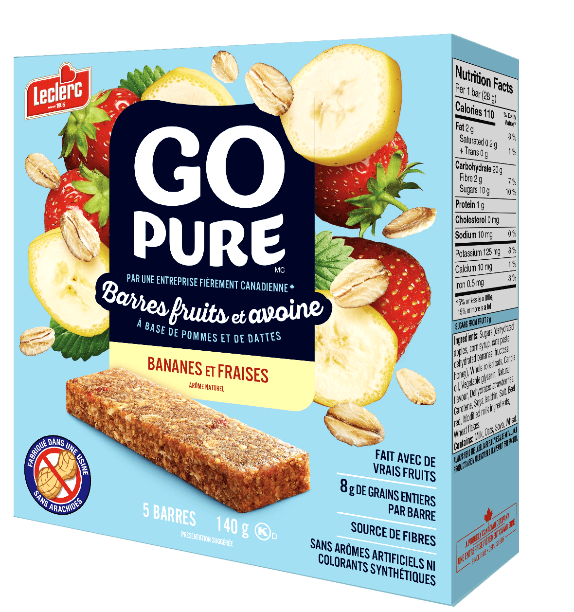 Le goût savoureux des framboises bien mélangé avec les bienfaits de l’avoine enfin en format familial! Une barre innovante et santé, faite avec de vrais fruits qui contient 8 g de grains entiers, et est une source de fibres. Elle est certifiée sans arachides et parfaite pour la boîte à lunch! Go Pure, Purement bon!