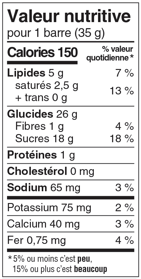 Sucres (glucose, sucre, sucre à glacer, fructose, miel), Chocolat au lait (sucre, beurre de cacao, liqueur de chocolat, substances laitières, lécithine de soya, extrait de vanille), Fondant chocolaté au fudge (sucre, glucose, huile de noix de coco, poudre de cacao, substances laitières modifiées, eau, monoglycérides, lécithine de soya, extrait de vanille), Riz croustillant givré (farine de riz, sucre, huile de canola, carbonate de calcium, sel, mélasse qualité fantaisie, bicarbonate de sodium, lécithine de soya), Huile de canola, Flocons d'avoine entière, Poudre de cacao, Glycérine, Substances laitières modifiées, Sel, Arôme naturel, Lécithine de soya, Amidon de blé, Beurre d'amande, Beurre d'arachide, Beurre de noix de cajou, Huile de tournesol.