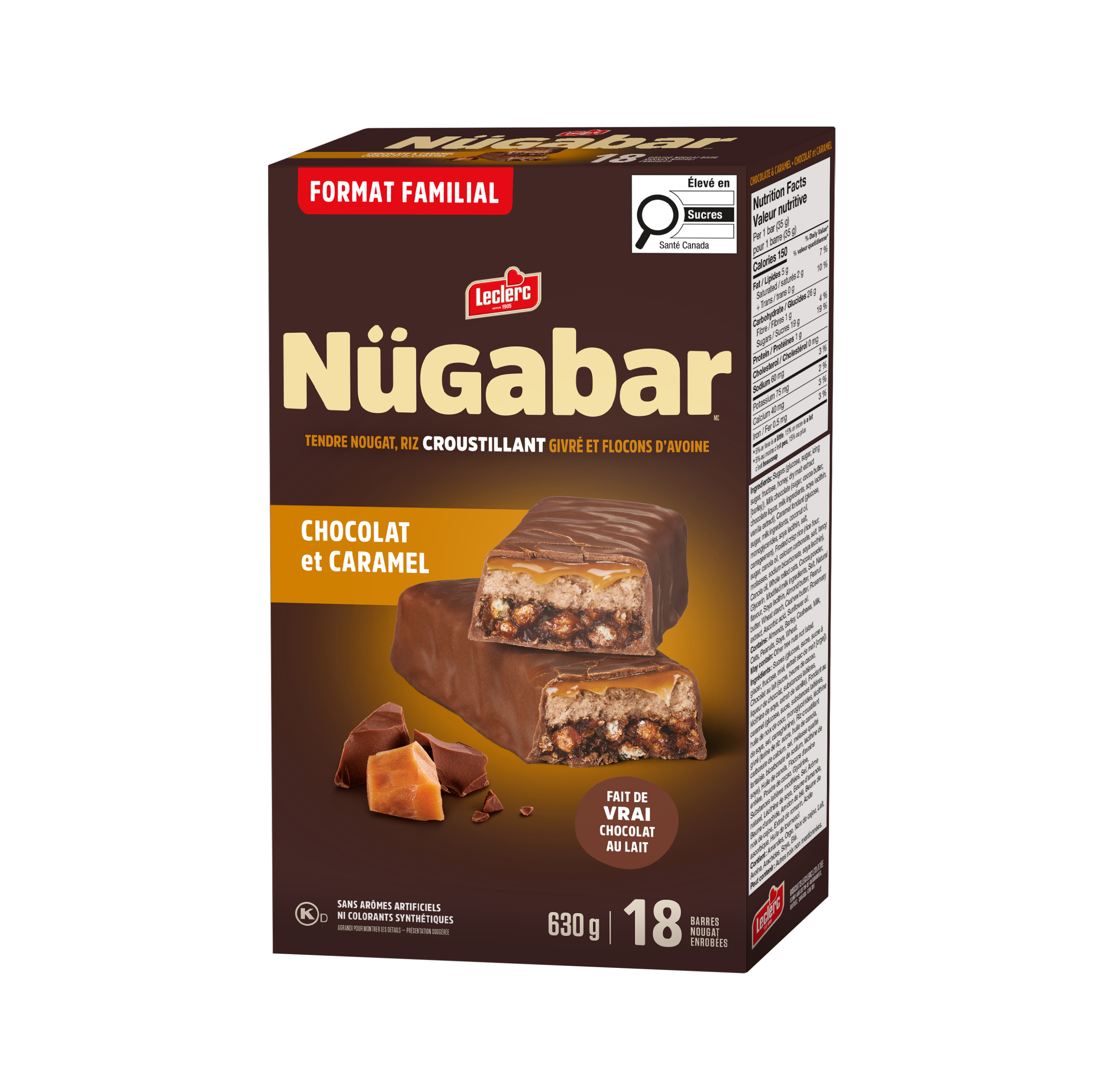 Sucres (glucose, sucre, sucre à glacer, fructose, miel, extrait sec de malt [orge]), Chocolat au lait (sucre, beurre de cacao, liqueur de chocolat, substances laitières, lécithine de soya, extrait de vanille), Riz croustillant givré (farine de riz, sucre, huile de canola, carbonate de calcium, sel, mélasse qualité fantaisie, bicarbonate de sodium, lécithine de soya), Huile de canola, Flocons d'avoine entière, Morceaux de biscuits au chocolat (farine de blé enrichie, sucre, poudre de cacao, huile de palme, glucose, bicarbonate de sodium, sel, arôme naturel, substances laitières), Substances laitières modifiées, Glycérine, Poudre de cacao, Amidon de blé, Sel, Arôme naturel, Lécithine de soya, Beurre d'amande, Beurre d'arachide, Beurre de noix de cajou, Extrait de romarin, Acide ascorbique, Carotène, Huile de tournesol.