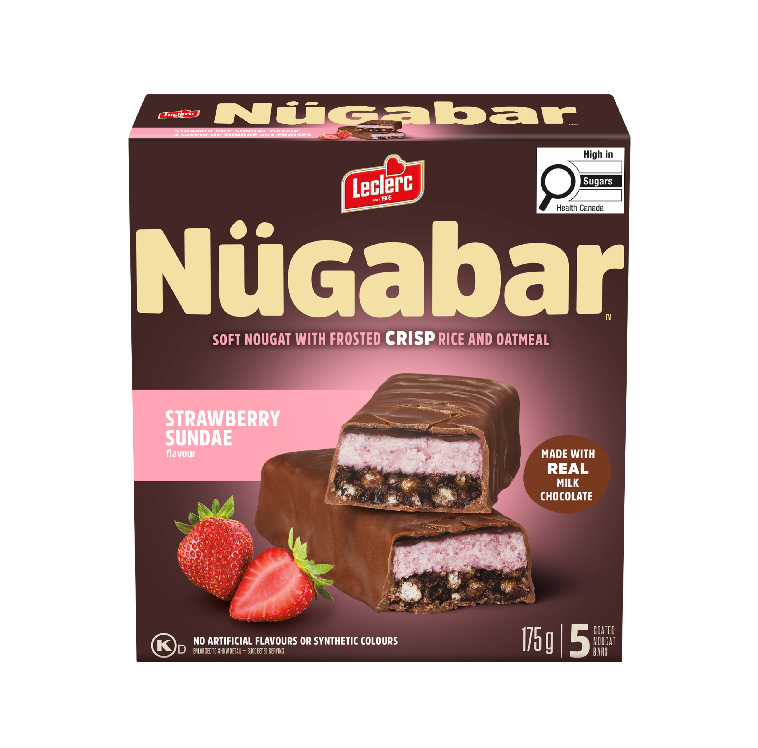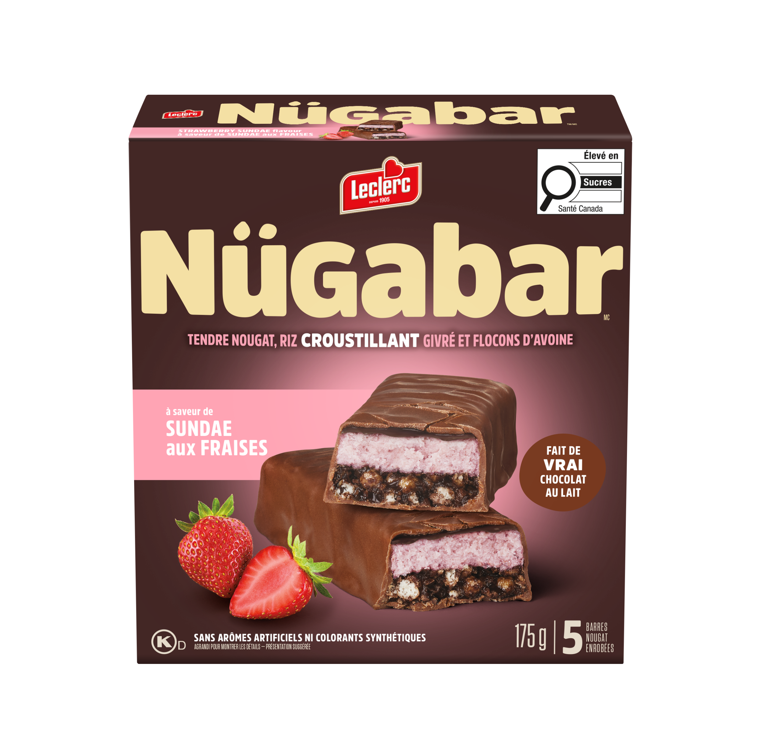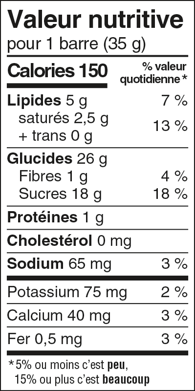 Sucres (glucose, sucre, sucre à glacer, fructose, miel, extrait sec de malt [orge]), Chocolat au lait (sucre, beurre de cacao, liqueur de chocolat, substances laitières, lécithine de soya, extrait de vanille), Riz croustillant givré (farine de riz, sucre, huile de canola, carbonate de calcium, sel, mélasse qualité fantaisie, bicarbonate de sodium, lécithine de soya), Fondant chocolaté au fudge (sucre, glucose, huile de noix de coco, poudre de cacao, substances laitières modifiées, eau, monoglycérides, lécithine de soya, extrait de vanille), Flocons d'avoine entière, Huile de canola, Glycérine, Poudre de cacao, Substances laitières modifiées, Amidon de blé, Arôme naturel, Sel, Lécithine de soya, Rouge de betterave, Beurre d'amande, Beurre d'arachide, Beurre de noix de cajou, Extrait de romarin, Acide ascorbique, Huile de tournesol.