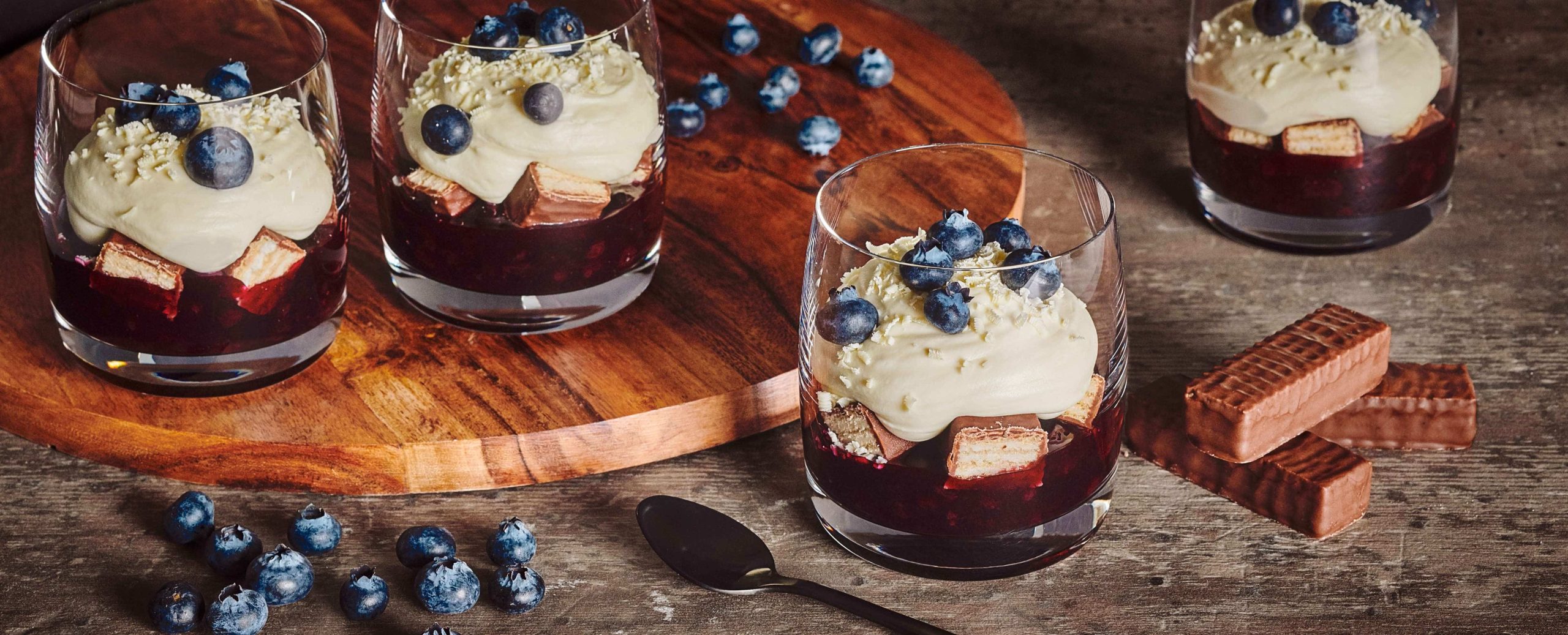 - Dans quatre pots d’une contenance de 250 ml (1 tasse) chacun, répartir la compote de bleuets et les gaufrettes. Ajouter la chantilly. À l’aide d’une râpe fine, gratter du chocolat blanc. Garnir de quelques bleuets frais, si désiré.